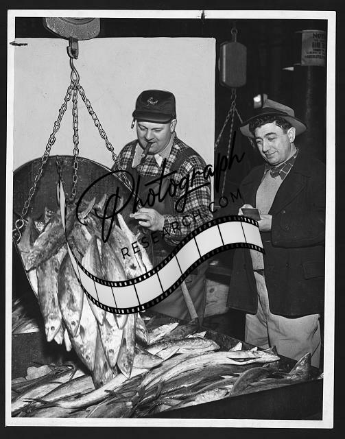 Men weighing the day's catch of fish at Fulton Fish Market,Bronx,New York,1952
