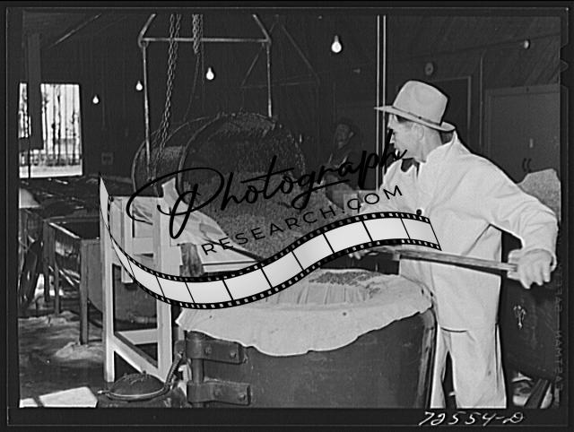 Title: Salinas, California. Removing drum of treated guayule seed from tank