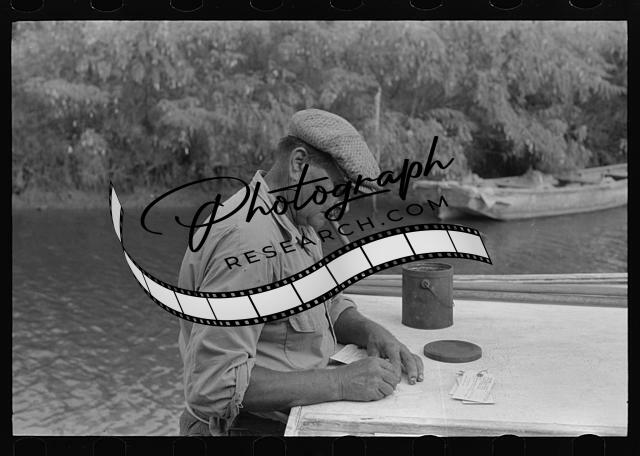 Oyster shipper making out tags,bags of oysters,Olga,Louisiana,LA,FSA,1938,2