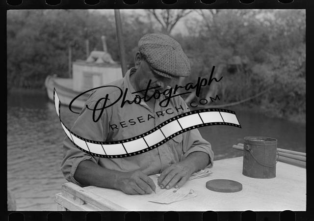 Oyster shipper making out tags,bags of oysters,Olga,Louisiana,LA,FSA,1938