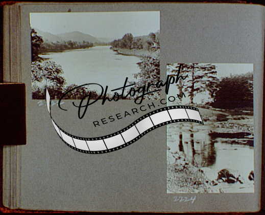 Title: Reference prints, 1919-1920, numbers 2133-2377. Stream flowing by stone building and large tree; Wooden buildings lining river bank with boat in foreground
