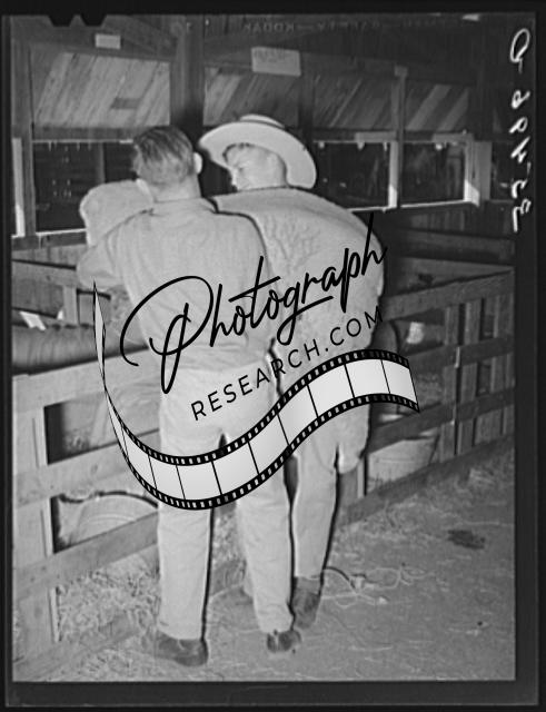 Title: Cowboy washing Hereford steer which will be shown next morning at the San Angelo Fat Stock Show. San Angelo, Texas