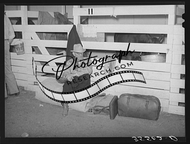 Title: Cowboy shoveling feed into pans for the stock which he is tending while at the San Angelo Fat Stock Show. San Angelo, Texas