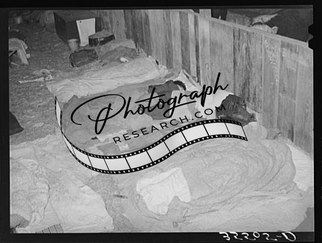 Title: Cattlemen sitting on rolled up camp bed in cattle barns at the San Angelo Fat Stock Show. San Angelo, Texas