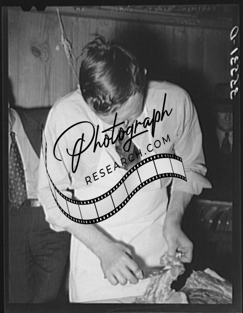 Title: FSA (Farm Security Administration) supervisor giving a demonstration of meat cutting before a group of FSA officials and supervisor at a district meeting in San Angelo, Texas