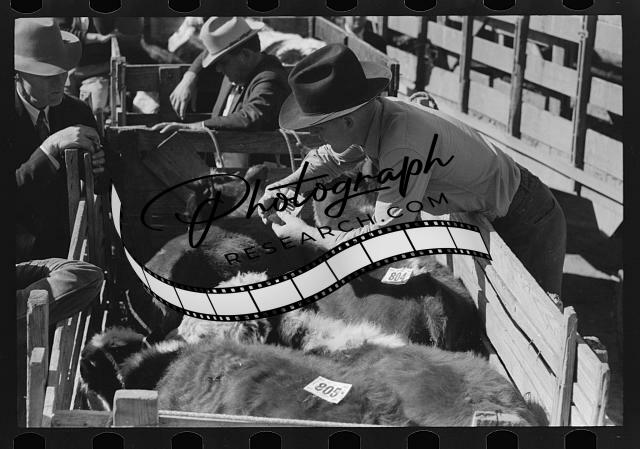 Title: Identification tag on cow, stockyards, San Angelo, Texas