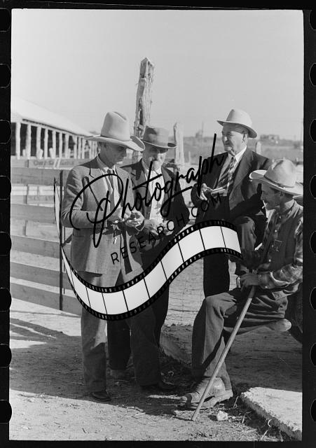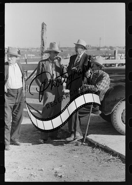 Title: Cattlemen talking at stockyards at San Angelo, Texas