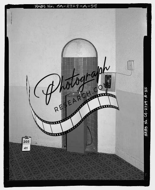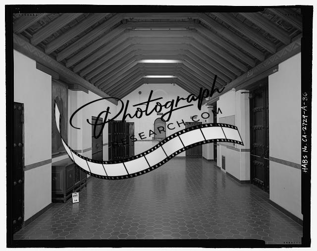 Title: Promenade (rear aisle), to south. Note drinking fountain in the distance, see also view CA-2729-A-35. - San Bernardino Valley College, Auditorium, 701 South Mount Vernon Avenue, San Bernardino, San Bernardino County, CA