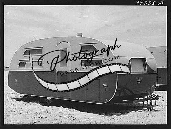 Title: Line-up of trailers at the FSA (Farm Security Administration) camp for defense workers. All the posts seen in the center are for electrical connections. San Diego, California