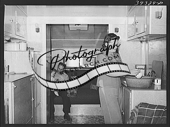 Title: Family moving into trailer at the FSA (Farm Security Administration) camp for defense workers. Before moving to the FSA camp this man had driven fifty-three miles each way daily to work. San Diego, California
