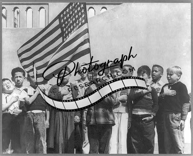 Title: San Francisco, Calif., April 1942 - Children of the Weill public school, from the so-called international settlement, shown in a flag pledge ceremony. Some of them are evacuees of Japanese ancestry who will be housed in War relocation authority centers for the duration