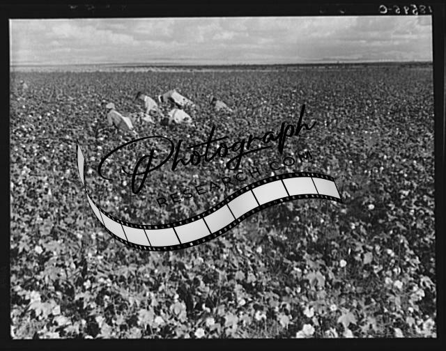 Title: Migratory field workers picking cotton in the San Joaquin Valley, California. Negroes, Mexicans, and refugee whites pick cotton together in this field. These pickers are being paid seventy-five cents per one hundred poounds of picked cotton. Strikers, organizing under the Congress of Industrial Organizations (CIO), are demanding one dollar