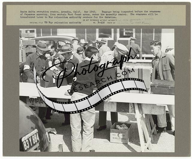 Santa Anita reception center, Arcadia, Calif. Apr. 1942. Baggage being inspected