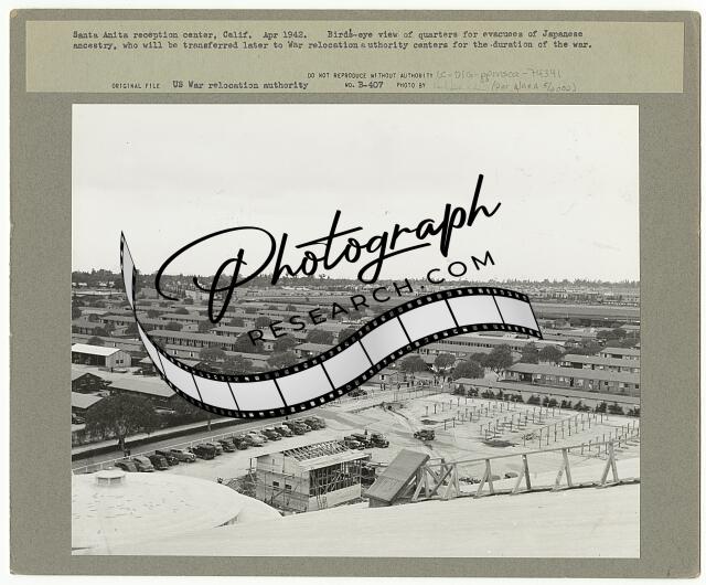 Santa Anita reception center, Arcadia, Calif. Apr. 1942. Bird's-eye view of quar