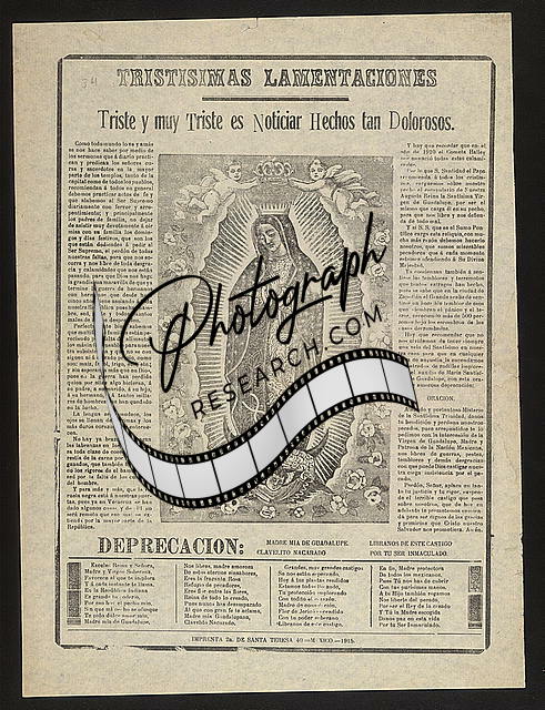 Summary: Broadside shows the statue of Our Lady of San Juan de los Lagos on the recto. Two cherubs hold a scroll above her head that reads, translated from the Latin, 'Immaculate mother pray for us.' This image of Our Lady has her wearing a triangular dress with a crescent moon at her feet. On the verso, the accompanying text tells of a miracle performed on Andres Torres on February 8, 1907, how he became ill with typhoid in Mexico City. It then gives an account of the stages of his illness and his recuperation as a result of his wife's prayers to the Holy Virgin of San Juan de los Lagos. A prayer to Our Lady is printed on the verso.