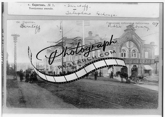 Public library,street,people,tracks,horse drawn carriages,Saratov,Russia,1916