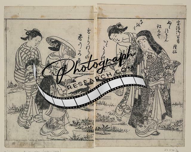 Summary: Japanese diptych print shows Saigyo surrounded by men trying to prevent him from leaving his house to become a priest.