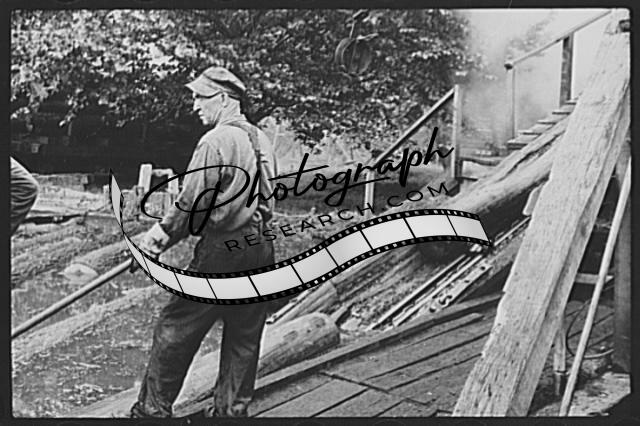 Title: Men spiking logs to go to ramp into sawmill. It was working only halftime and was even slower in winter. 'It's kinder hard them times. Concrete and steel's taking the place of lumber nowadays. Erwin, West Virginia