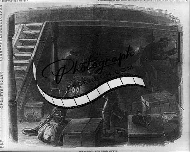 Searching for Stowaways,c1850,Men holding candles,lanterns,baggage,ship