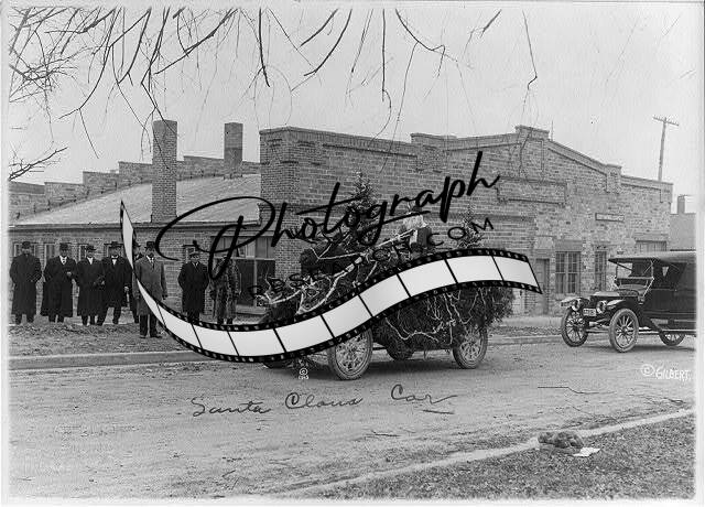 Santa Claus car,automobile decorated w/ Christmas trees,moose,deer heads,c1913