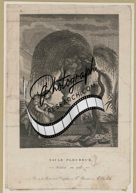 Saule Pleureur, Print shows woman seated beside tombstone and a tree (weeping willow?), on right.
