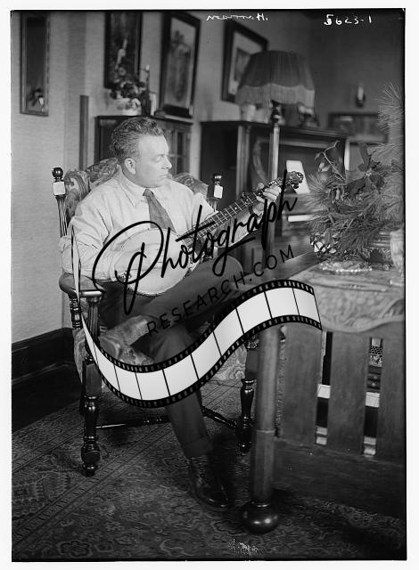 Harrison playing banjo,stringed instruments,chairs,seats,piano,Bain News Service