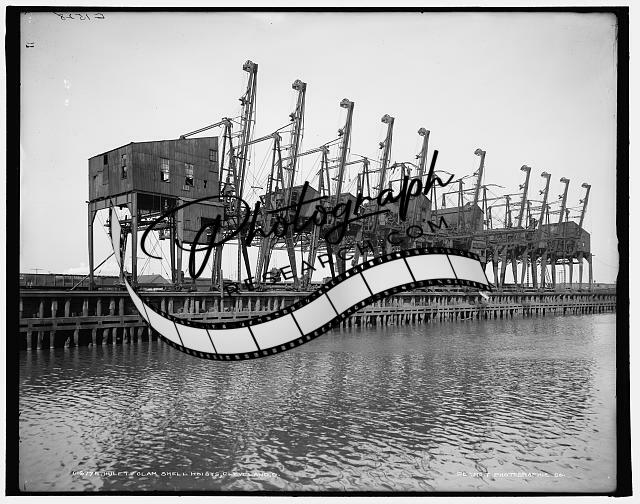 Hulett clam shell hoists,equipment,pier,wharves,machinery,Cleveland,Ohio,OH,1900