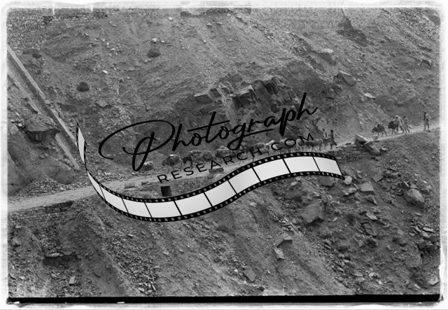 Afghan men driving laden donkeys along a mountain path through an arid, rocky landscape