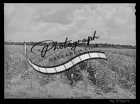 Title: Tractors in the sugarcane fields, with the farm supervisor discussing the problem of cultivation after excessive rains with the foreman, who was chosen from among their own group by the members of the cooperative. Terrebonne Project, Schriever, Louisiana