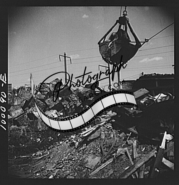 Title: Washington, D.C. Scrap salvage campaign, Victory Program. Powerful hydraulic press for pressing metal scrap into blocks in the yard of a wholesale junk company