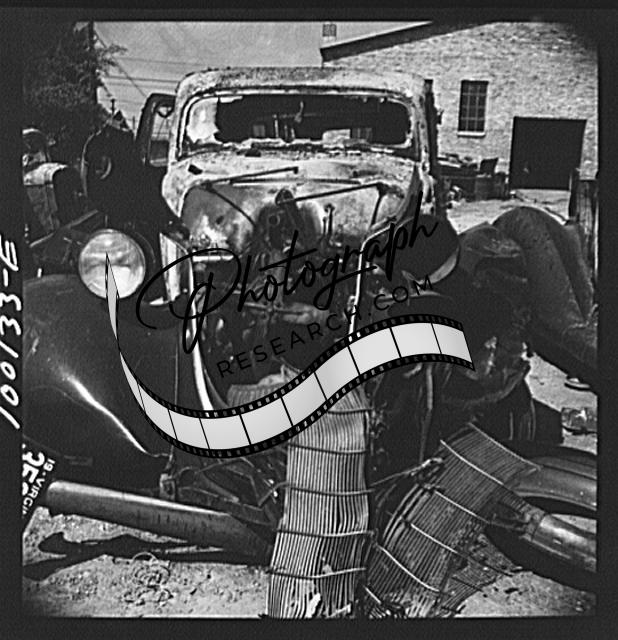 Title: Washington, D.C. Scrap salvage campaign, Victory Program. After saleable parts are removed from old cars, the cars are burned in order to strip them of useless materials and to obtain metal skeleton for scrap