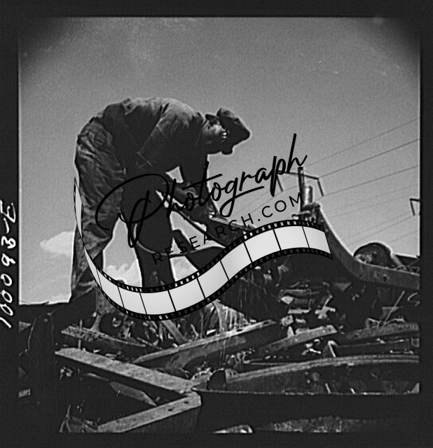 Title: Washington, D.C. Scrap salvage campaign, Victory Program. Crane loads blocks of scrap metal onto a freight car in yard of wholesale junk company