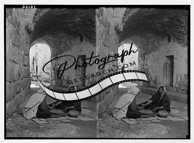 Women of Bethlehem grinding in courtyard before their home,West Bank,Middle East 1