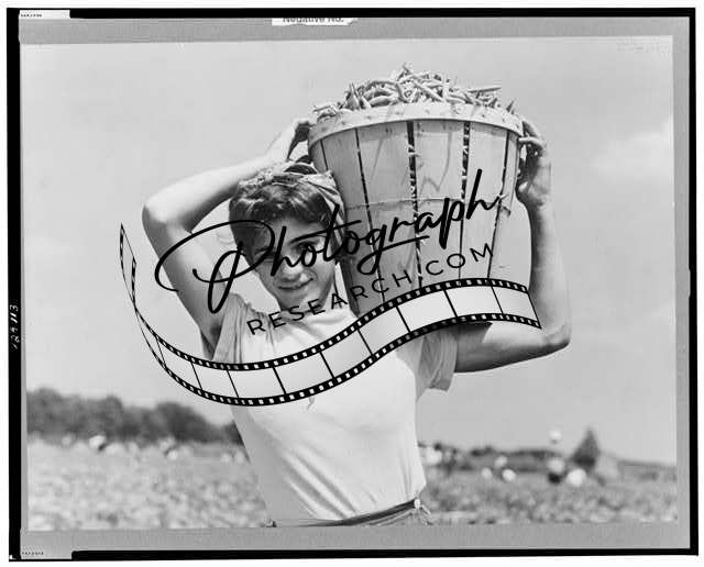 Title: Weighing baskets of beans picked by day laborers from nearby towns. Seabrook Farms, Bridgeton, New Jersey
