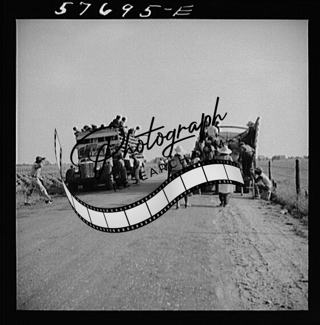 Title: Day laborers to pick string beans are brought by truck from nearby towns. Some even come in their own cars from Philadelphia to work at Seabrook Farms. Bridgeton, New Jersey