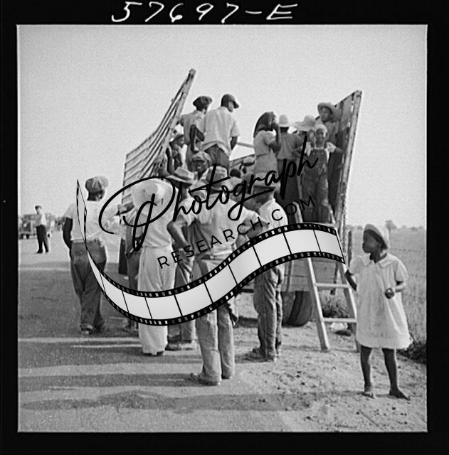 Title: Day laborers to pick string beans are brought by truck from nearby towns. Some even come in their own cars from Philadelphia to work at Seabrook Farms. Bridgeton, New Jersey