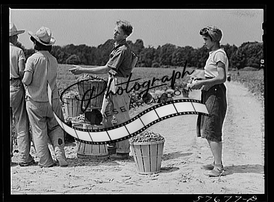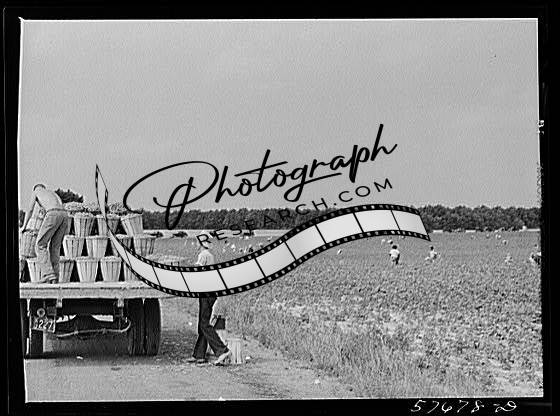 Title: Weighting baskets of beans picked by day laborers from nearby towns. Seabrook Farms, Bridgeton, New Jersey