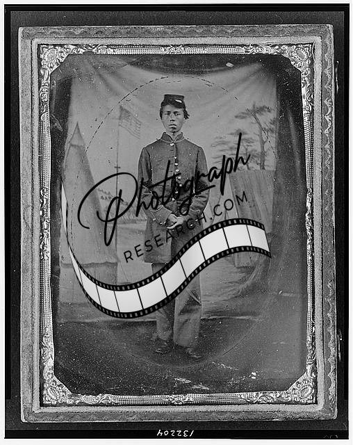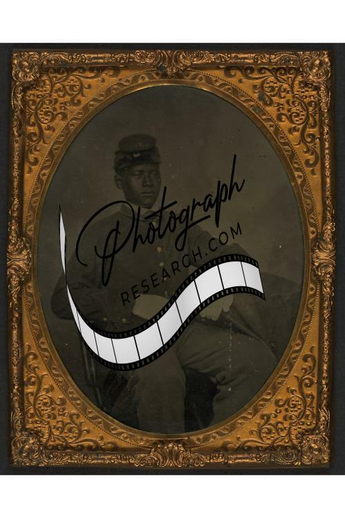 Summary: Photograph shows an unidentified African American soldier, half-length portrait, seated with hands on lap, facing front.