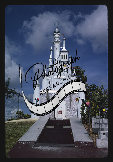 Title: Seating and landscape, Castle Amusement Park mini golf, Polk Street, Riverside, California