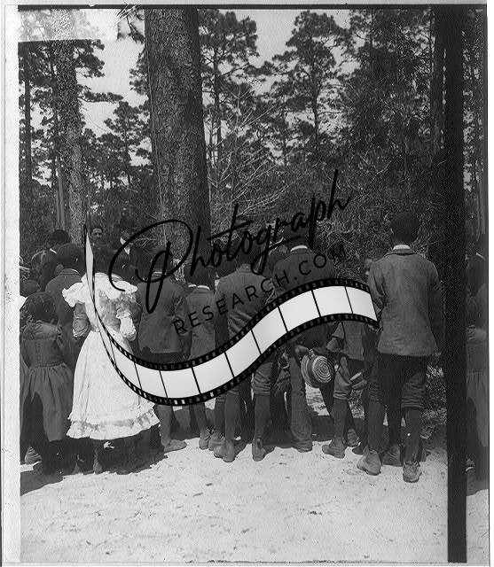 Theodore Roosevelt speaking,group, African American children,woods,c1906
