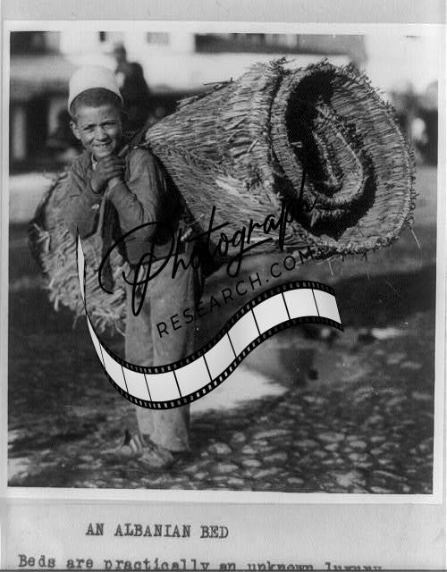 An Albanian bed,Boy carrying a three ply straw mat,Albania,1923,Red Cross