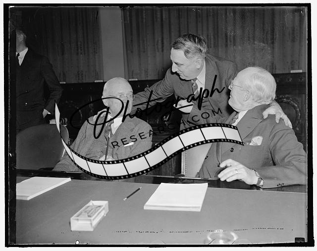 Title: Begin study of security changes. Washington, D.C., Nov. 5. Outstanding business, industrial and labor leaders attended the first meeting of the Social Security Advisory Council today. Possible changes in the Social Security Act were discussed at the meeting which was held in the Secretary of Labor's office. Here we see, left to right: J. [?] Douglas Brown, Princeton University; Gerard Swope, President of General Electric Co.; Matthew Woll, A.F. of L.; Philip Murray, C.I.O.; as they talk to Arthur J. Altmeyer, Chairman of the Social Security Board, 11/5/37