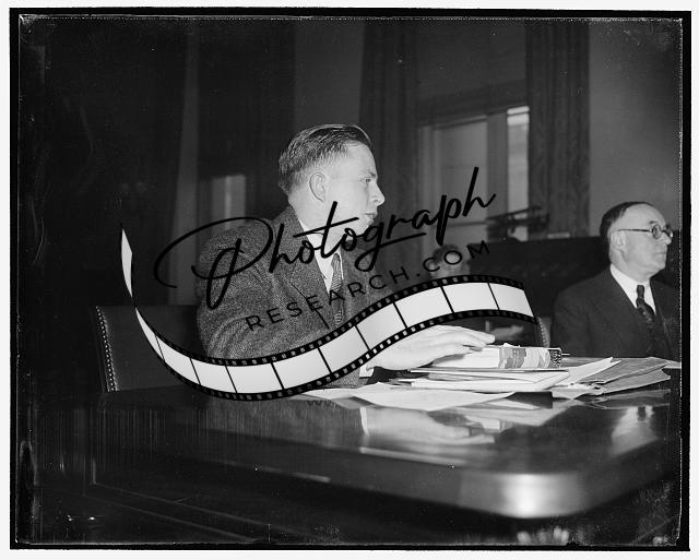 Title: Senate Committee questions Undersecretary of Agriculture. Washington, D.C., March 10. Sen. James F. Byrnes (left), Chairman, and Senator Lynn J. Frazier, member of the Senate Unemployment and relief Committee, questioning M.L. Wilson, Undersecretary of Agriculture, at the Capitol today. Wilson told the Committee that vocational and extension programs for farm youths must be greatly expanded. He said many young people on farms today are in actual distress and many of whom do not see clearly any promising opportunities for the future, 3/10/38