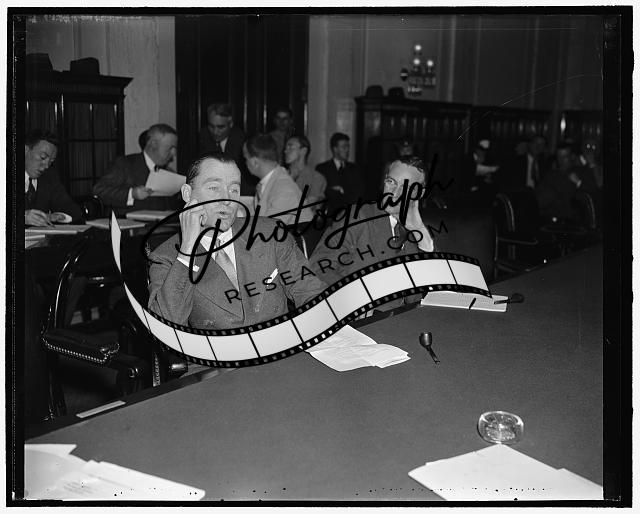 Title: Senate Finance Committee begins work on new defense financing program. Washington, D.C., May 29. The Senate Finance Committee today began work on the new defense financing program. It is expected that a thorough revision of the nation's tax structure will be made in an effort to end deficit financing. In this picture, left to right, are members of the Committee. Senator Arthur H. Vandenberg, Senator Pat Harrison, Chairman, Senator Robert F. Lafollette, Senator Arthur Capper, and Senator John C. Townsend