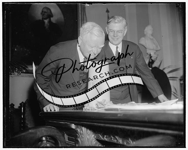 Title: Sen. F. Ryan Duffy (with cheese) and George L. Mooney, Secty, Nat'l Cheese Inst., Plymouth, Wisc., present cheese to Roosevelt, 3/5/38