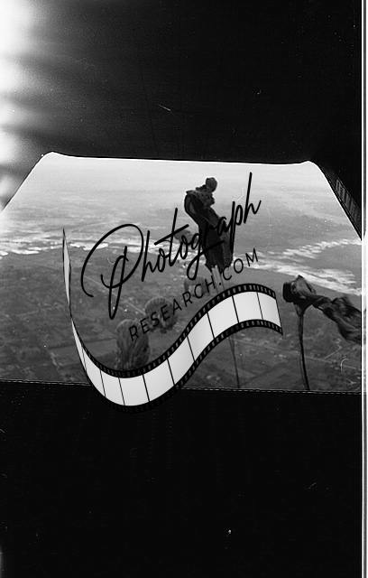 Paratrooper drop, aboard plane, Photograph shows parachutes dropping from an airplane during the Vietnamese Conflict.