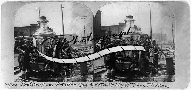 Photo of Stereograph,Modern Fire Fighters,Fire Engine,Burned Area,c1902,Fire