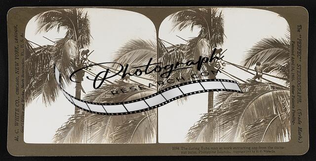 The daring tuba man at work extracting sap from the cocoanut palm, Philippine Is