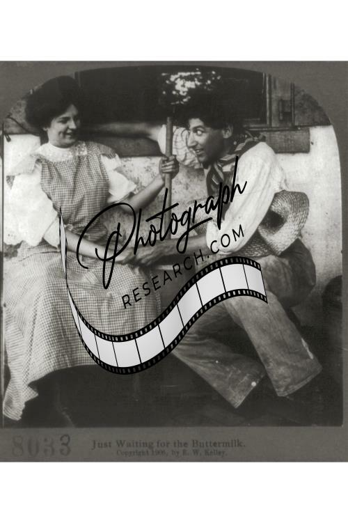 Just waiting for the buttermilk,c1906,man and women churning butter with plunger