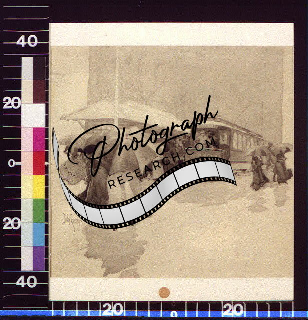 Commuters with umbrellas at street car station,Jules Vallee Guerin,Railroad,RR